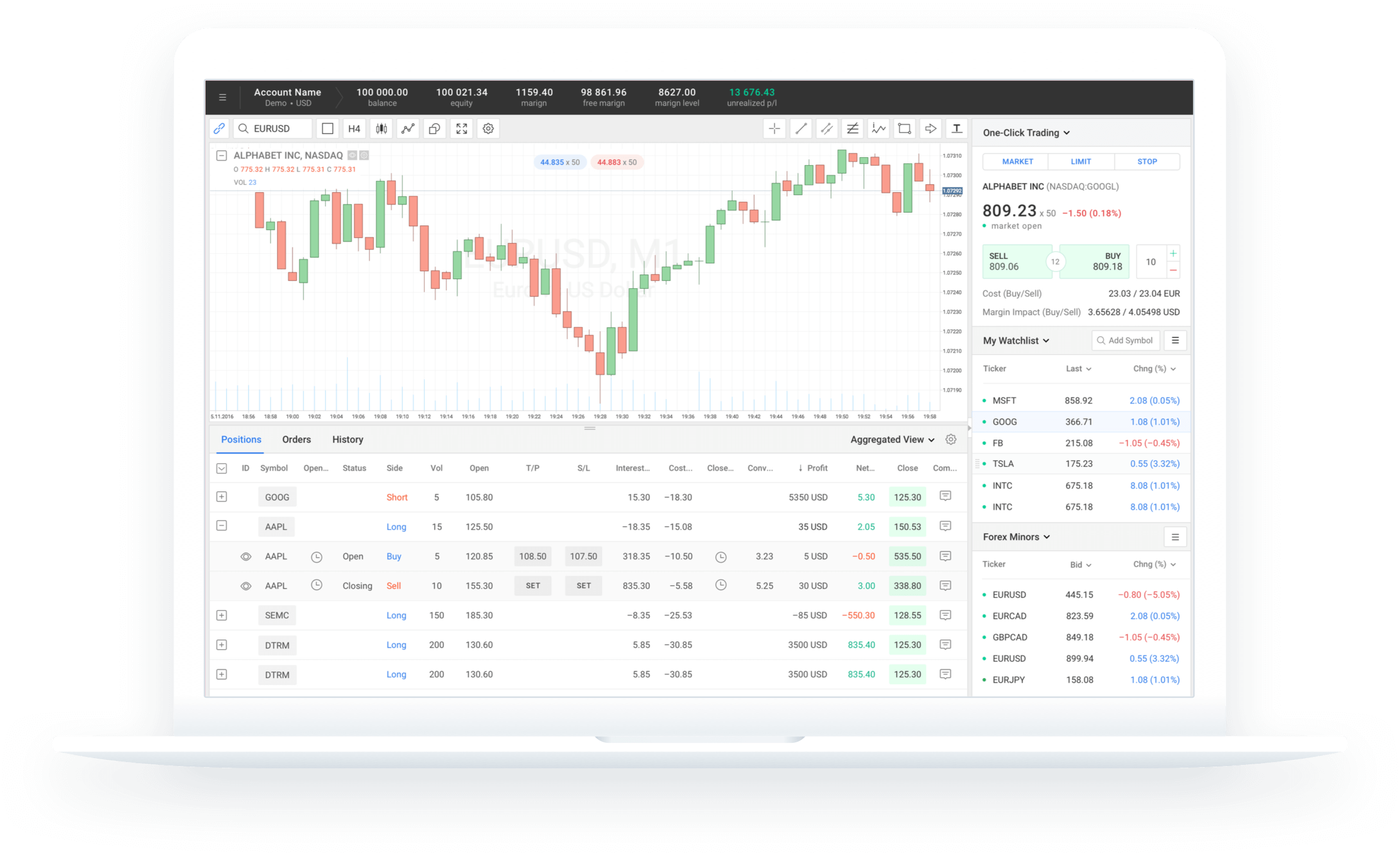 Charts and Watchlists are armed with a symbol lookup feature, which makes them easy to find, add/remove specific instrument to analyze and trade.