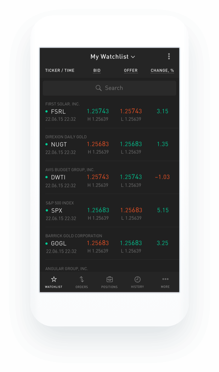 StocksTrader features custom and system watchlists. User can edit custom watchlists by adding/removing instruments. System watchlists like Top losers, Top gainers, Volume leaders updated by system in real-time.